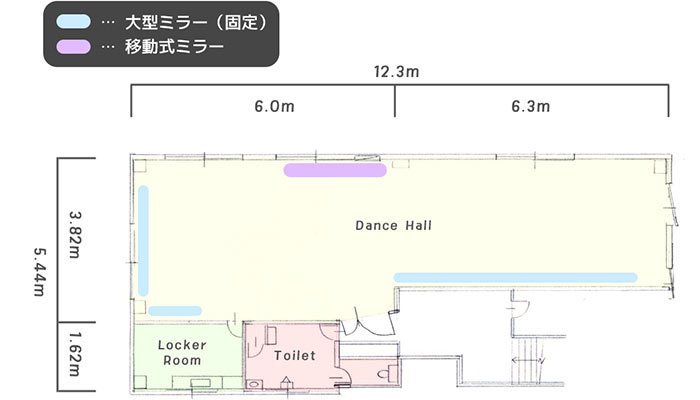 ダンスフロア、ロッカーローム、トイレの3部屋お使いいただけます。